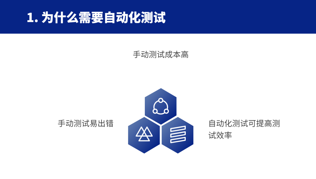 首先,我们来谈谈为什么需要自动化测试。相信大家都有过这样的经历,使用传统手工测试,浪费了很多时间进行重复的操作,或者发现问题,但无法追溯问题出现的原因,这对于项目的进度和质量显然都是有很大的负面影响的。为了避免这些问题,我们需要使用自动化测试来代替繁琐的手工测试过程。自动化测试可以显著降低测试成本,提高测试效率,增加测试覆盖率,提高测试质量。 -