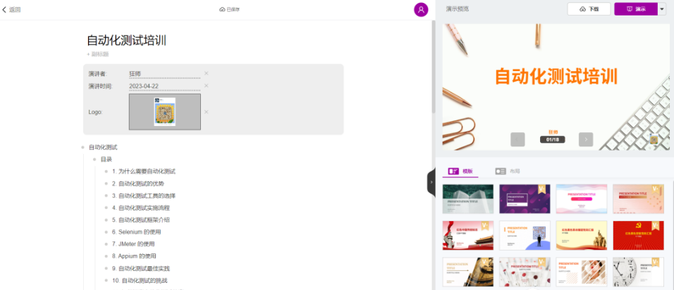今天给大家分享两个工具,帮助你全自动生成PPT,接下来以自动化测试为主题,教大家如何2分钟生成好PPT。