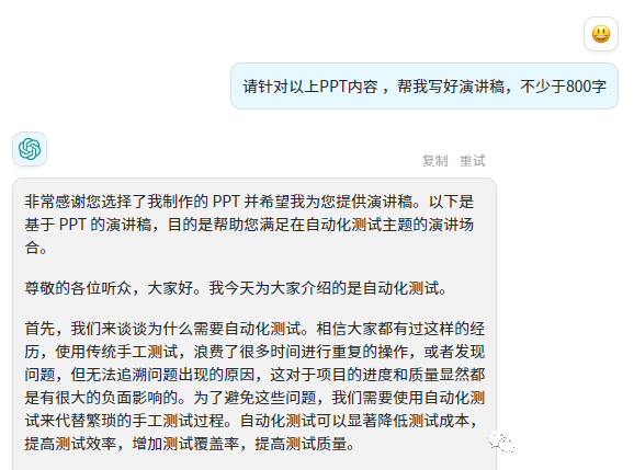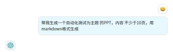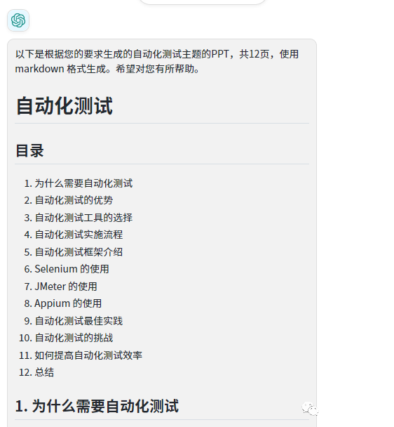 1、打开ChatGPT页面,输入prompt,告诉它,让它帮你生成一份自动化测试为主题的PPT,如: