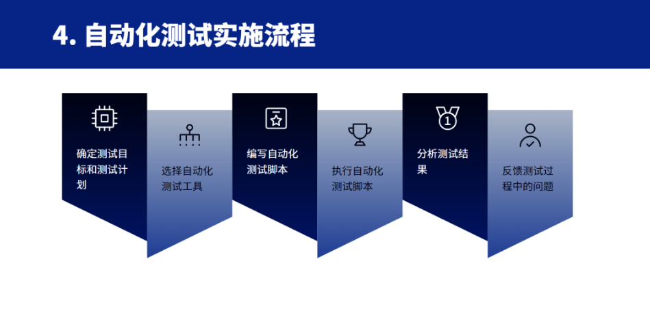 然后,我们看一下自动化测试的实施流程。首先需要确定测试目标和测试计划,然后选择自动化测试工具,并编写脚本,执行测试脚本,分析测试结果,并及时反馈测试中出现的问题。一个合理的自动化测试实施流程,可以大大提高自动化测试的效率。 -