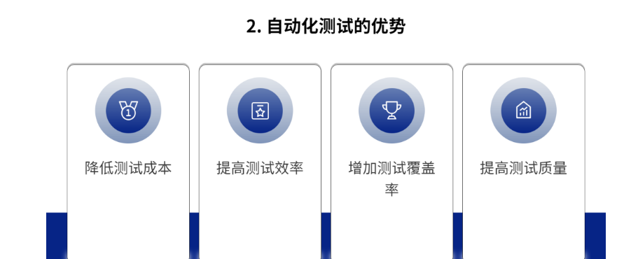 接下来,我们来看一下自动化测试的优势。首先,自动化测试可以显著降低测试成本。手工测试需要进行大量的重复操作,这样不仅浪费时间,还需要更多的人力成本,而自动化测试可以通过编写脚本来去除这些人工操作。其次,自动化测试可以提高测试效率。自动化测试可以自动执行测试用例,并快速反馈测试结果,而手工测试若想快速反馈,则必须使用更多的人力进行测试。第三,自动化测试可以增加测试覆盖率。传统手工测试所有的测试场景同时测试是不可能完成所有的测试覆盖,自动化测试可以通过编写脚本覆盖更多的测试场景。最后,自动化测试可以提高测试质量。自动化测试可以减少因疏漏或忘记测试某些场景而导致的测试漏洞。 -