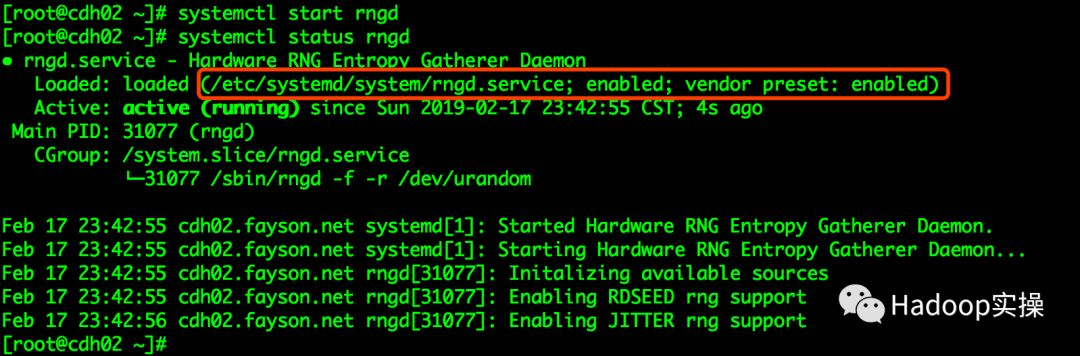 该告警说明由于OS系统的Entropy值过低导致。关于熵(Entropy)是描述系统混乱无序程度的物理量,一个系统的熵越大则说明系统的有序性越差(即不确定性越大),具体可以参http://www.it610.com/article/2708278.htm。简单的说在Hadoop中有多个级别的应用使用到Data at rest encryption,加密需要使用到随机数,只有当系统的熵(Entropy)值越大才能确保系统随机数的随机性。那本篇文章Fayson主要介绍如何增大系统熵(Entropy)值。