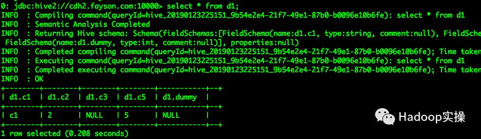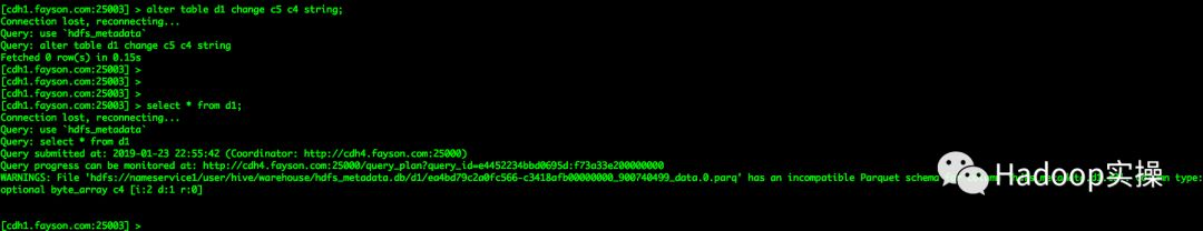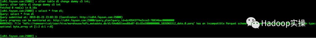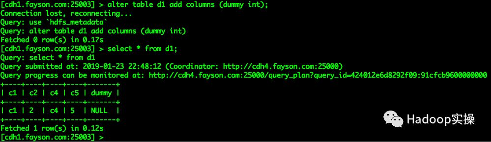 表中dummy新增的列的值填充为NULL,Hive和Impala查询均符合预期。