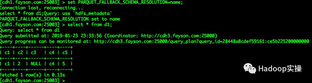2.Impala对表的列顺序与Parquet文件中列的顺序比较敏感,默认情况下需要确保表列的顺序与Parquet中列顺序一致,如果列顺序与Parquet文件列不一致则需要在会话中设置set PARQUET_FALLBACK_SCHEMA_RESOLUTION=name;属性。