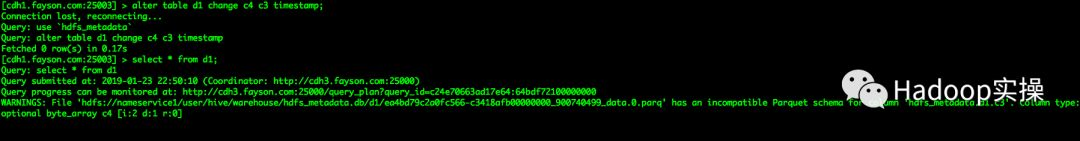 WARNINGS: File 'hdfs://nameservice1/user/hive/warehouse/hdfs_metadata.db/d1/f44290ca8d0484dc-aec3029c00000000_2136518694_data.0.parq' has an incompatible Parquet schema for column 'hdfs_metadata.d1.c3'. Column type: TIMESTAMP, Parquet schema: