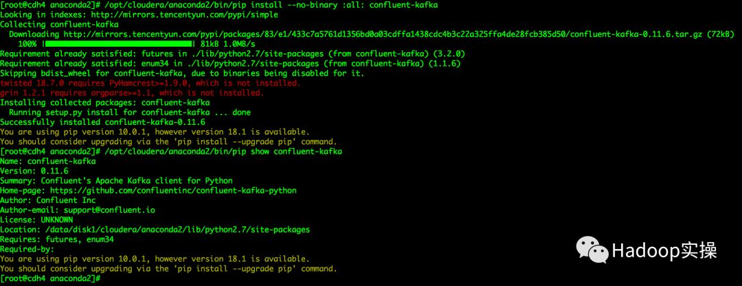 [root@cdh4 anaconda2]# /opt/cloudera/anaconda2/bin/pip install --no-binary :all: confluent-kafka