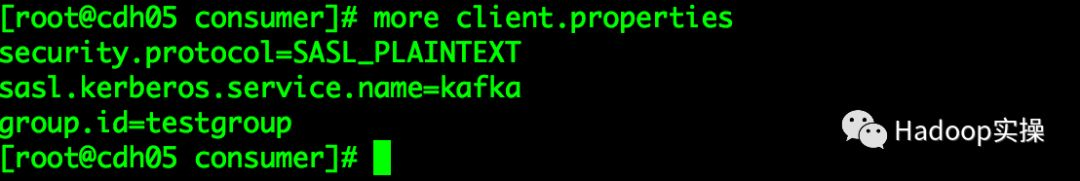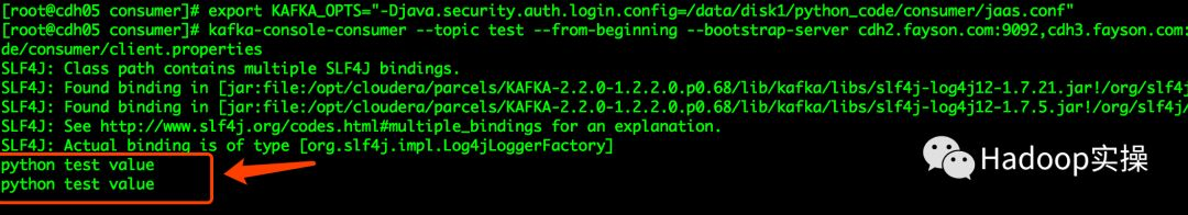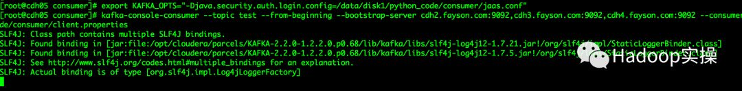 kafka-console-consumer --topic test --from-beginning --bootstrap-server cdh2.fayson.com:9092,cdh3.fayson.com:9092,cdh4.fayson.com:9092 --consumer.config /data/disk1/python_code/consumer/client.properties