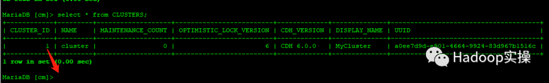 | 1 | cluster | 0 | 6 | CDH 6.0.0 | MyCluster | a0ee7d9d-e901-4664-9924-83d967b1516c |