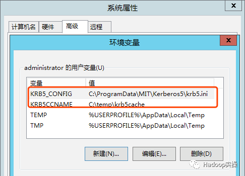 变量名:KRB5_CONFIG,变量值:C:\ProgramData\MIT\Kerberos5\krb5.ini