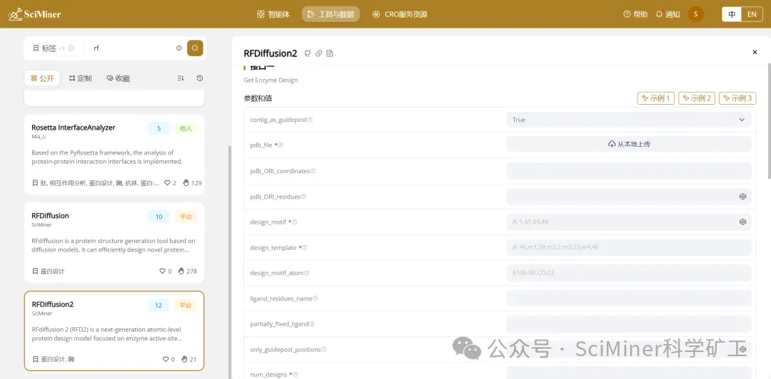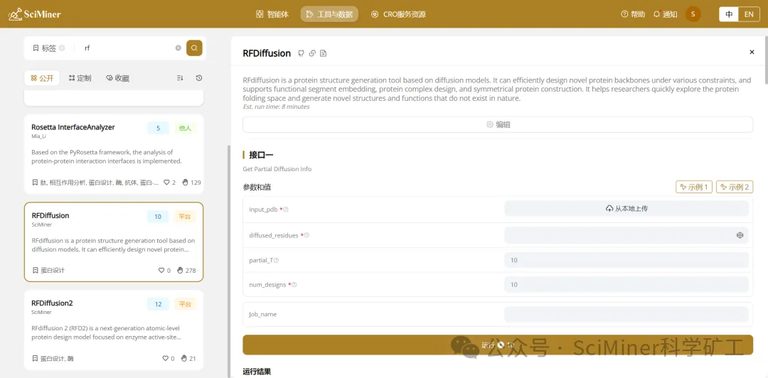 RFdiffusion 的突破固然令人兴奋,但对于大多数科研团队而言,模型复杂、依赖繁重、环境脆弱,使其往往停留在“看得到却用不上”的状态。SciMiner 的使命,就是打破这道天然的技术壁垒。我们将 RFdiffusion v1 与 v2 以工程化方式上线,使其变成任何科研人员都能直接调用的工具:无需部署、无需配置、无需高性能集群,一台电脑、一个浏览器就能完成设计尝试。