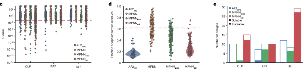 很多设计的蛋白在计算机模拟中很完美,但一到湿实验阶段,往往面临“不表达”或“包涵体”的尴尬。SolubleMPNN 通过调整参数和模型偏好,显著提升了设计蛋白的水溶性。