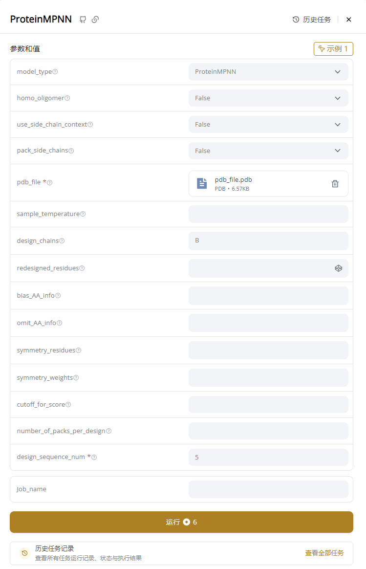 SciMiner 为 ProteinMPNN 提供了全量参数配置界面,让每一项科学决策都有据可依: