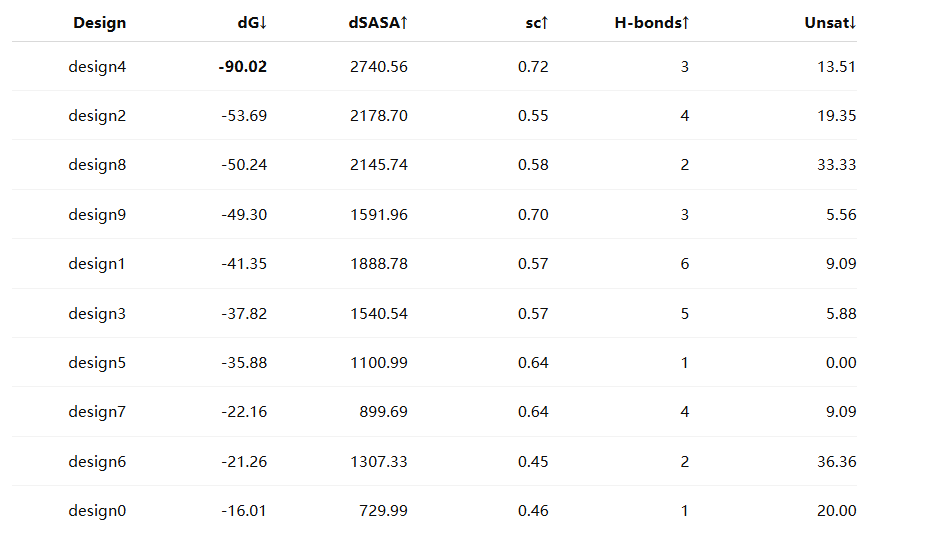 案例洞察: 在实战中我们发现,虽然 AI 能产出极优样本(如 design4),但样本间的质量波动明显(dG 从约 -54 到 -16 不等)。这进一步证明了:高效的可视化筛选平台对于“后筛与人工甄别”至关重要。 SciMiner 让研究者能在一分钟内通过指标看板锁定那一两颗“明珠”。