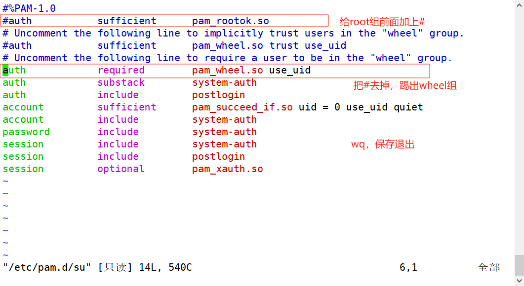 如果开启第二行,表示只有root用户和wheel组内的用户才可以使用su命令