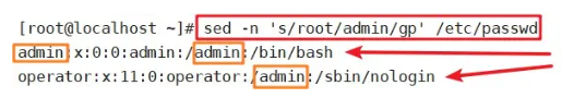 sed -n 's/root/admin/p' /etc/passwd #在etc/passwd里root替换成admin(默认更换一个root)