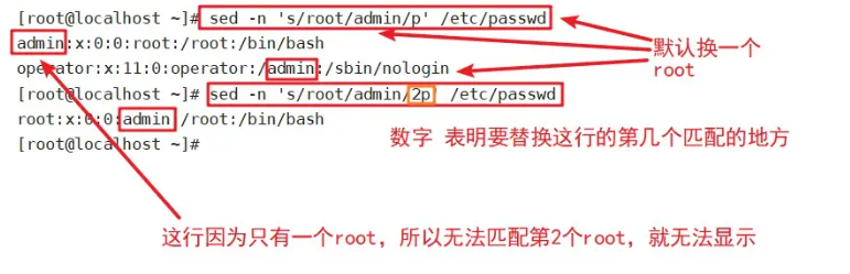 sed -n 's/root/admin/2p /etc/passwd #2p,表面要替换这行的第几个匹配的地方