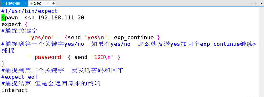 exp_continue附加于某个expect 判断选项之后,可以是该项被匹配后还能继续匹配expect 判断语句内的其他项。exp_continue类似于控制语句的continue语句。表示允许expect继续向下执行命令。