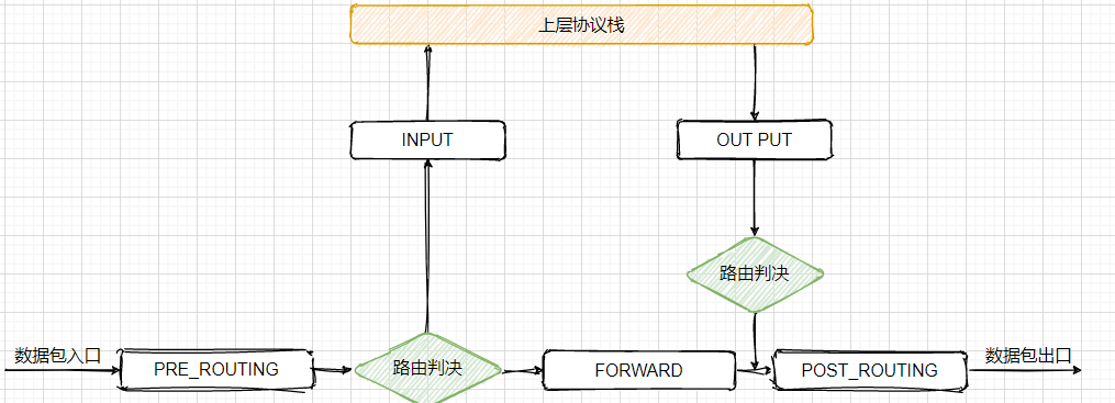 2.如果数据包是进入本机的,数据包就会到达INPUT链。数据包到达INPUT链后, 任何进程都会收到它。本机上运行的程序可以发送数据包,这些数据包经过OUTPUT链,然后到达