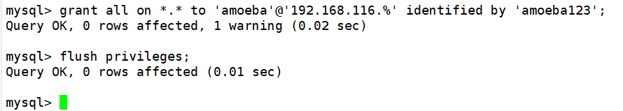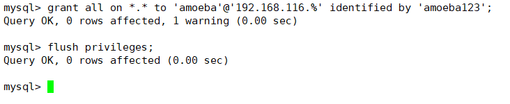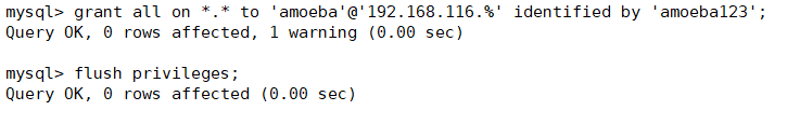 grant all on *.* to 'amoeba'@'192.168.116.%' identified by 'amoeba123';