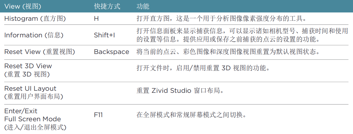 Zivid Studio GUI 底部有五个可用视图的选项。这些视图可显示以下功能: