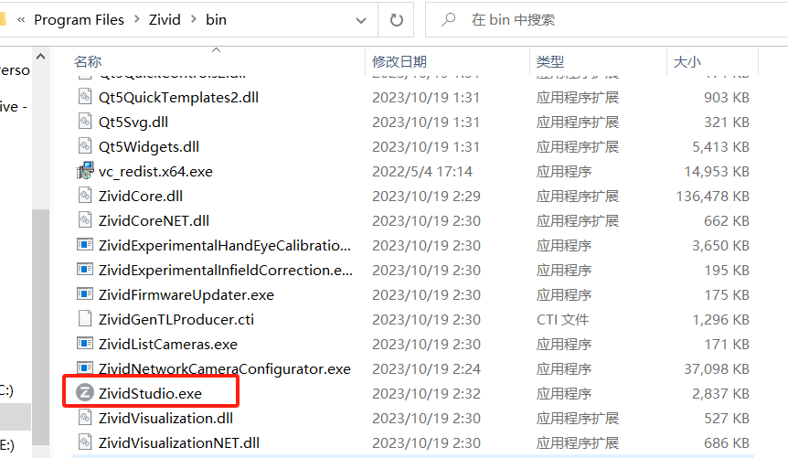 找到电脑中软件安装位置,打开bin文件夹,找到zivid studio打开即可进入到软件图形化界面。