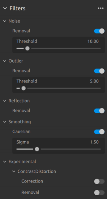 如果与小局部区域内相邻像素的距离大于以mm为单位指定的阈值,滤波器会移除这些点。 |