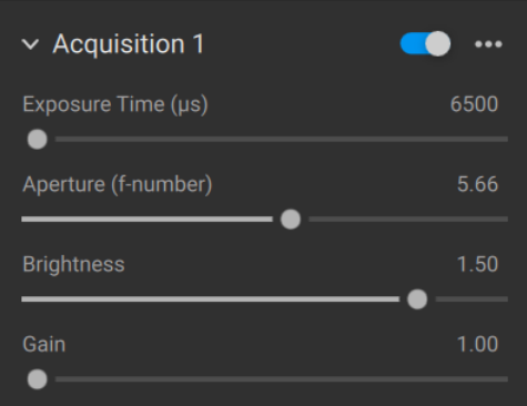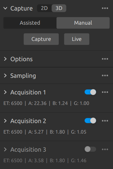 选择“Manual Mode”后,您就可以点击“Add Acquisition”(添加采集) 按钮添加其他采集项。默认情况下,添加的每个新采集项都使用上一个采集项的设置。如果您需要克隆某个采集项,您可以单击该采集项旁边的三个点,然后点击“Clone”(克隆)。使用同一菜单重置采集设置或删除单个采集项。使用复选框禁用或启用采集项。单击“HDR”按钮捕获具有指定采集设置的图像;未选中的采集项将被忽略