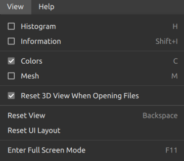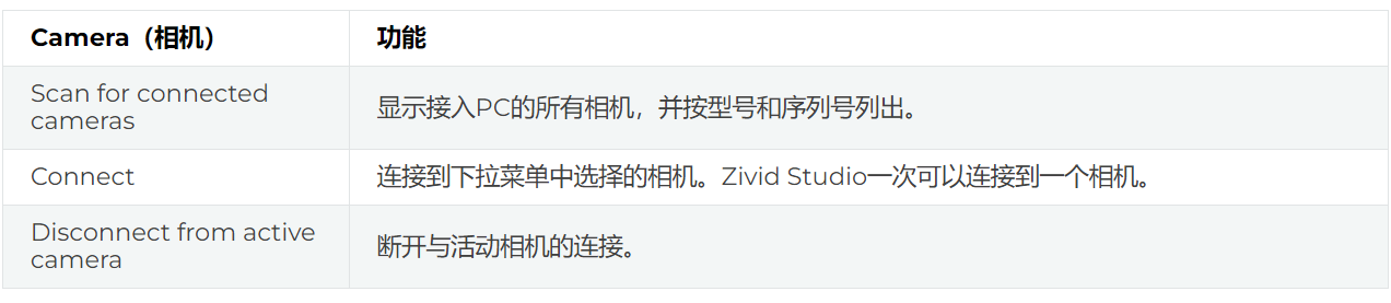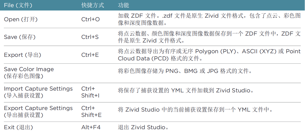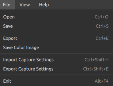 工具栏位于 Zivid Studio GUI 顶部。它由数个下拉菜单组成,用于处理文件、控制 GUI 以及获取有关Zivid 软件的信息。