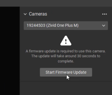 每个 SDK 版本都与相机固件相匹配,SDK 会确保相机运行兼容的固件。当 Zivid Studio 连接 到相机时,它会检查相机是否有匹配的固件。如果固件不匹配,系统会提示您更新相机上的固件。