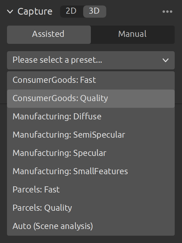 在每个类别中,您可以找到各种不同的预设值。这些是由场景复杂性、工作距离或其中对象的典型材料属性类型区别而来的。不同的相机型号根据它们的常见应用也有不同的预设值。