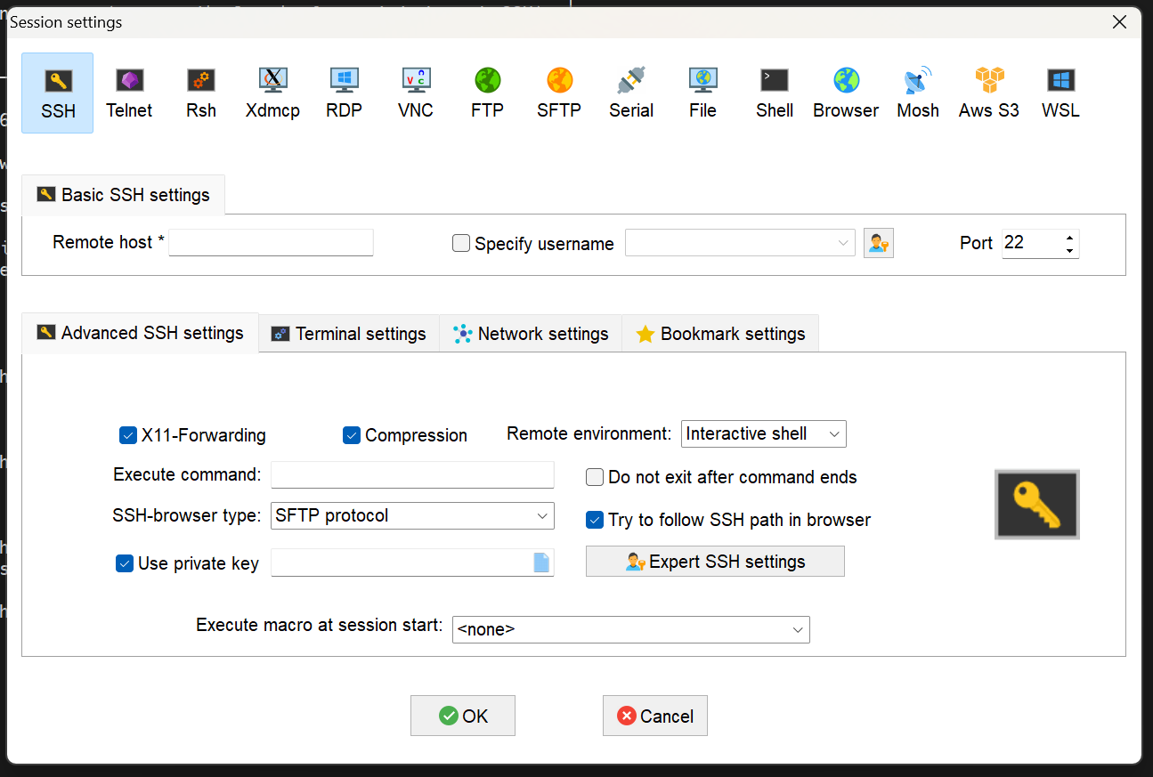 7.建立连接,点一下advanced ssh settings,把use private key勾选上,填上ip地址,用户名。