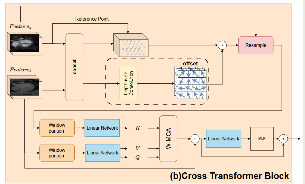 鉴于Swin Transformer依赖于固定的窗口形状,并且需要对跨模态特征查询进行更广泛和分散的探索,我们选择避免类似于Vision Transformer模型中的计算密集型全局搜索[16]。相反,我们引入了一种可变形操作,如图2所示,该操作使用深度卷积来建立局部邻域中体素位置之间的关系。此操作计算一个统一的变形趋势,称为f集,它会动态调整以适应所有特征。f集是一个具有三个通道的张量,表示特征图上一个点在x、y和z方向上的位移。重要的是,f集张量的形状与特征图的形状相匹配。在最后一步中,我们对F特征区域进行重新采样以获得变形特征图,并相应地调整其位置。此过程类似于对原始查询窗口应用相同的可变形操作。通过引入可变形算子,我们有效地将具有固定感受野的Swin Transformer转换为具有可变形感受野的等效模型。
