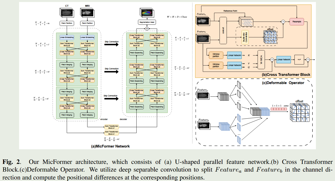 本文提出了一种新型的多模态变压器——MicFormer。用于处理多模态任务中的特征融合和匹配。通过利用双流模型,MicFormer熟练地从两种模式中抽象出来。其功效的核心是可变形交叉注意力模块,该模块促进了两种模态特征之间的查询和交流。出现的架构确保了多层次、多模态语义特征的有效融合,在多模态分割精度方面取得了重大进展。简而言之,我们的工作的关键贡献是:1)我们提出了一种新的双流多模态特征融合变换器骨干网络。通过使用可变形的交叉注意力融合模块,多模态特征被连续匹配 2)我们提出了一种新的可变形交叉注意力模块,用于自动适应搜索空间。