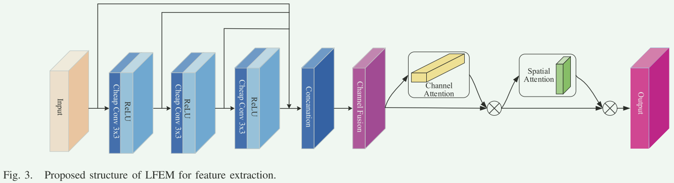 在所提出的 LFEM 中,由于以下三重优点,采用了三个尺寸为 3 × 3 的奇数小卷积核。 首先,奇数卷积核可以在保留中心像素的同时提取中心周围像素的特征,从而增强了图像的空间相关性。 其次,较小的卷积核可以通过多层叠加获得较大的感受野,同时需要较少的参数和较低的计算占用。 第三,使用多个小卷积核代替大卷积核可以给网络产生更多的非线性激活层,增强非线性表达能力,进一步获得更好的学习特征。