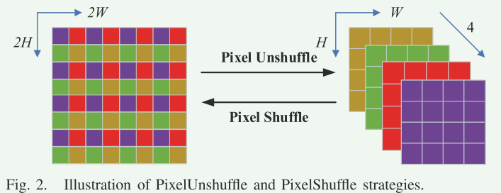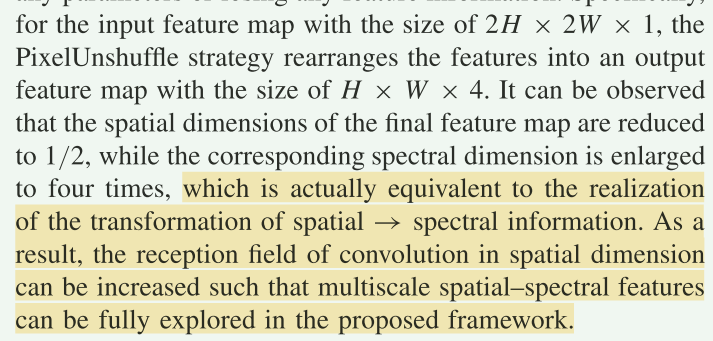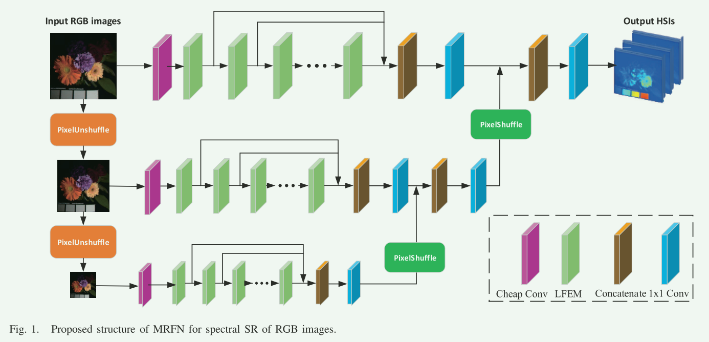 1)提出了一种多分辨率特征提取和融合框架,用于从 RGB 输入重建 HSI,其中通过 PixelUnshuffle 策略将输入设计为原始 RGB 图像的多分辨率版本。 这种结构using a spatial → spectral information transformation优雅地融合了不同尺度的特征,不仅在整个重建过程中保持了原始图像的空间分辨率,而且实现了多个光谱分辨率子结构的并行推理。