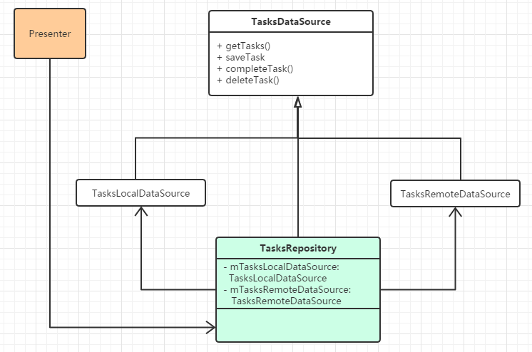 - TasksRepository:相当于整个Model层的门面,根据逻辑判断决定数据来自于本地数据库或是网络。Presenter层只与它打交道。