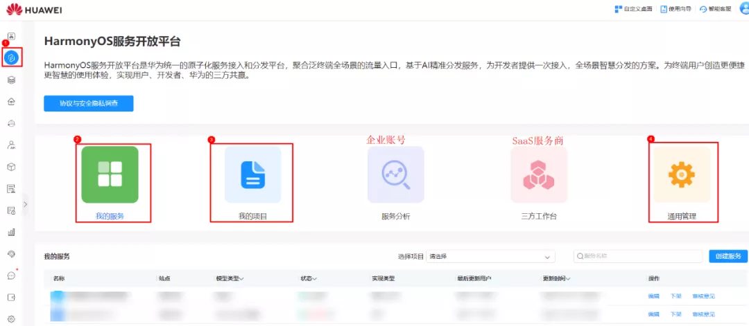 2021年12月31日的变更除了在平台创建服务模型增加一种“HarmonyOS服务”,支持HarmonyOS服务独立上架以外,还在平台首页增加SaaS服务商“三方工作台”入口(普通开发者没有,企业开发者才有)。
