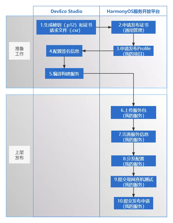如图2所示,大家可以在DevEco Studio和HarmonyOS服务开放平台两处完成上架和发布的全部操作,前5个步骤是上架的准备工作,将这些准备好,才能顺利走完后续的上架发布流程。