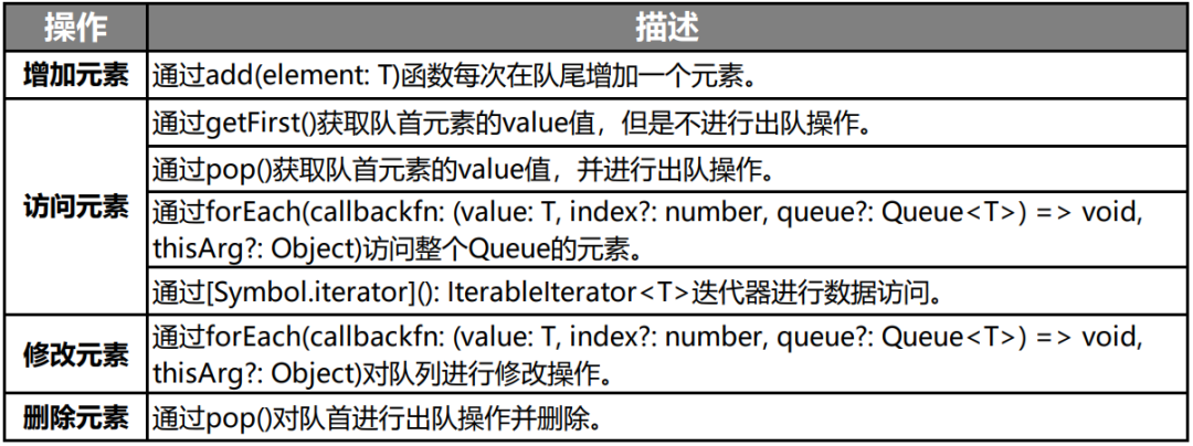 Queue可用来构造队列对象,存储元素遵循先进先出的规则。Queue依据泛型定义,要求存储位置是一片连续的内存空间,初始容量大小为8,并支持动态扩容,每次扩容大小为原始容量的2倍。Queue底层采用循环队列实现,入队及出队操作效率都比较高。Queue进行增、删、改、查操作的相关API如下: