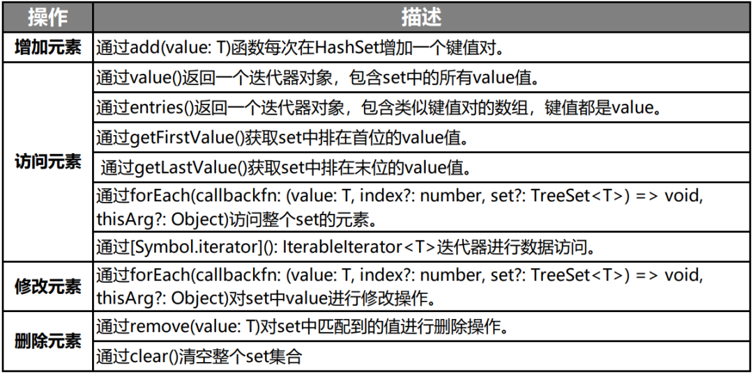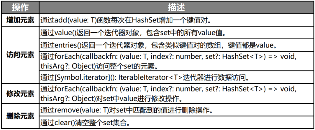 HashSet可用来存储一系列值的集合,存储元素中value是唯一的。依据泛型定义。集合中通过value的hash值确定其存储位置,从而快速找到该值。HashSet初始容量大小为16,支持动态扩容,每次扩容大小为原始容量的2倍。value的类型满足ECMA标准中要求的类型。HashSet底层基于HashTable实现,冲突策略采用链地址法。HashSet进行增、删、改、查操作的相关API如下: