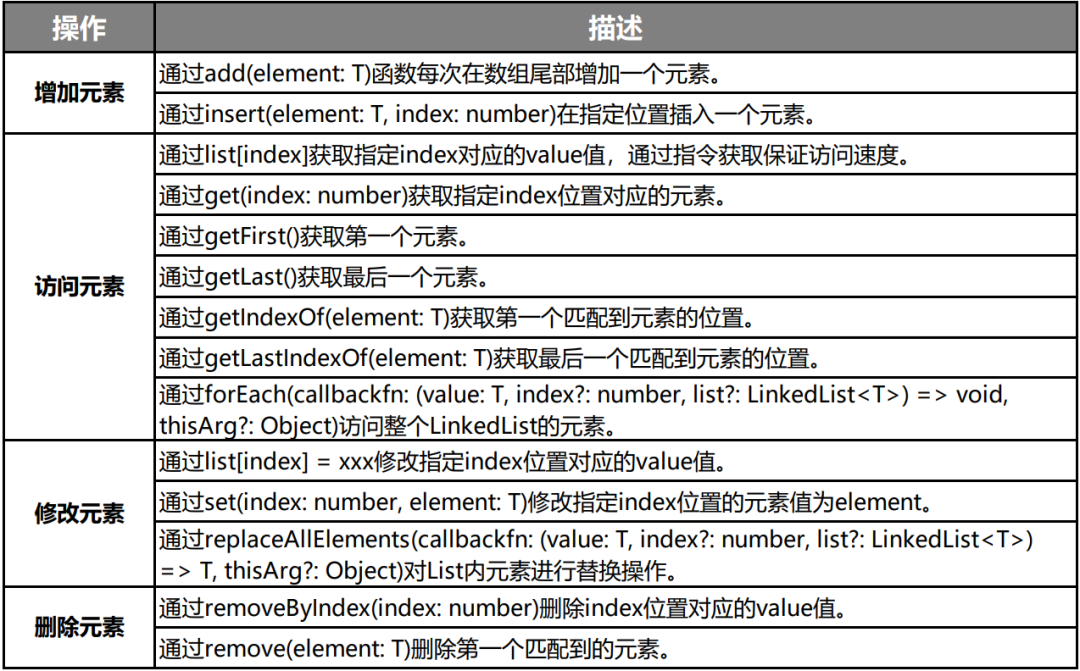 可以通过get/set等接口对存储的元素进行修改,LinkedList进行增、删、改、查操作的相关API如下: