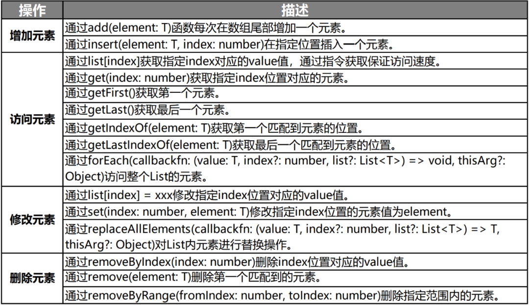 可以通过get/set等接口对存储的元素进行修改,List进行增、删、改、查操作的相关API如下: