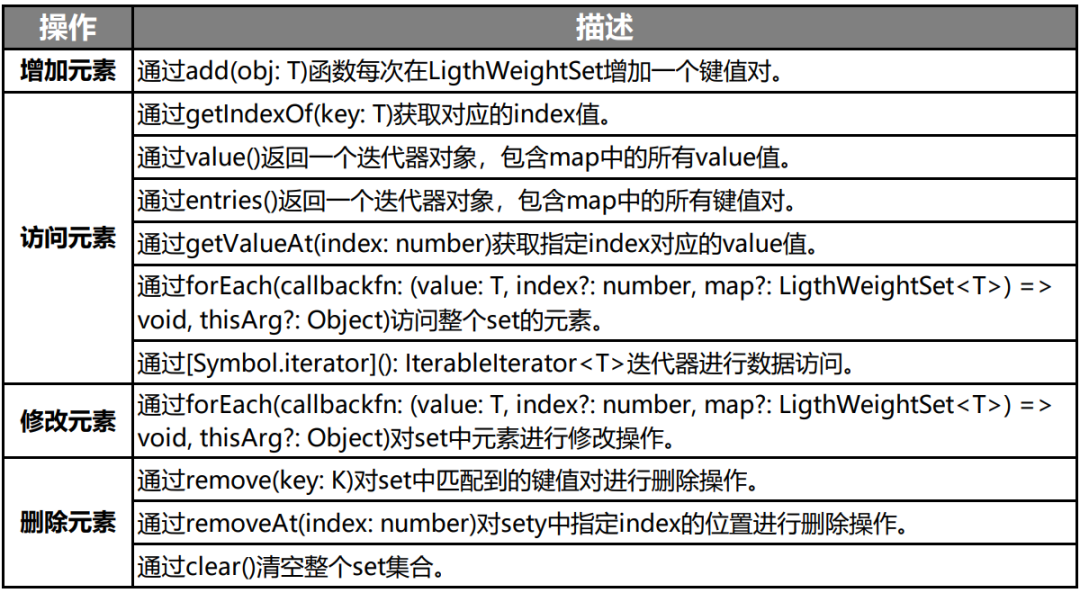 LigthWeightSet可用来存储一系列值的集合,存储元素中value是唯一的。LigthWeightSet依据泛型定义,采用更加轻量级的结构,初始默认容量大小为8,每次扩容大小为原始容量的2倍。集合中的value值的查找依赖于hash以及二分查找算法,通过一个数组存储hash值,然后映射到其他数组中的value值,value的类型满足ECMA标准中要求的类型。