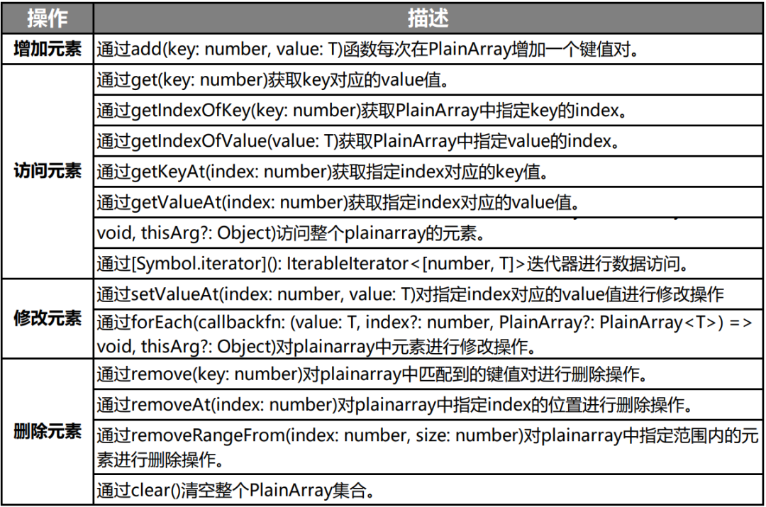 初始默认容量大小为16,每次扩容大小为原始容量的2倍。PlainArray的查找策略基于二分查找法。PlainArray进行增、删、改、查操作的相关API如下: