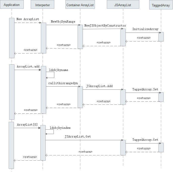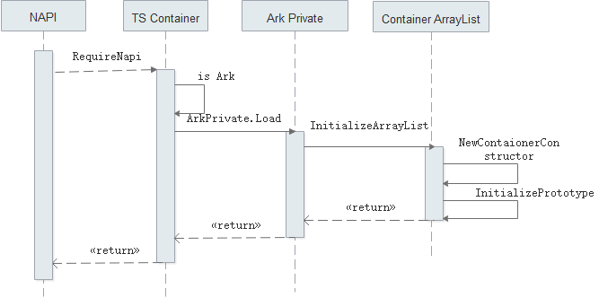 在方舟开发框架中,通过NAPI的统一框架对外层提供容器类。下面,我们将以ArrayList为例,介绍基于NAPI的容器类的加载。如下图所示,是容器类初始化流程,在NAPI加载的过程中,会通过ArkPrivate.Load接口加载对应的容器类。ArrayList在引擎中会初始化Constructor以及Prototype并返回,最后应用侧可以获得该容器类并使用。