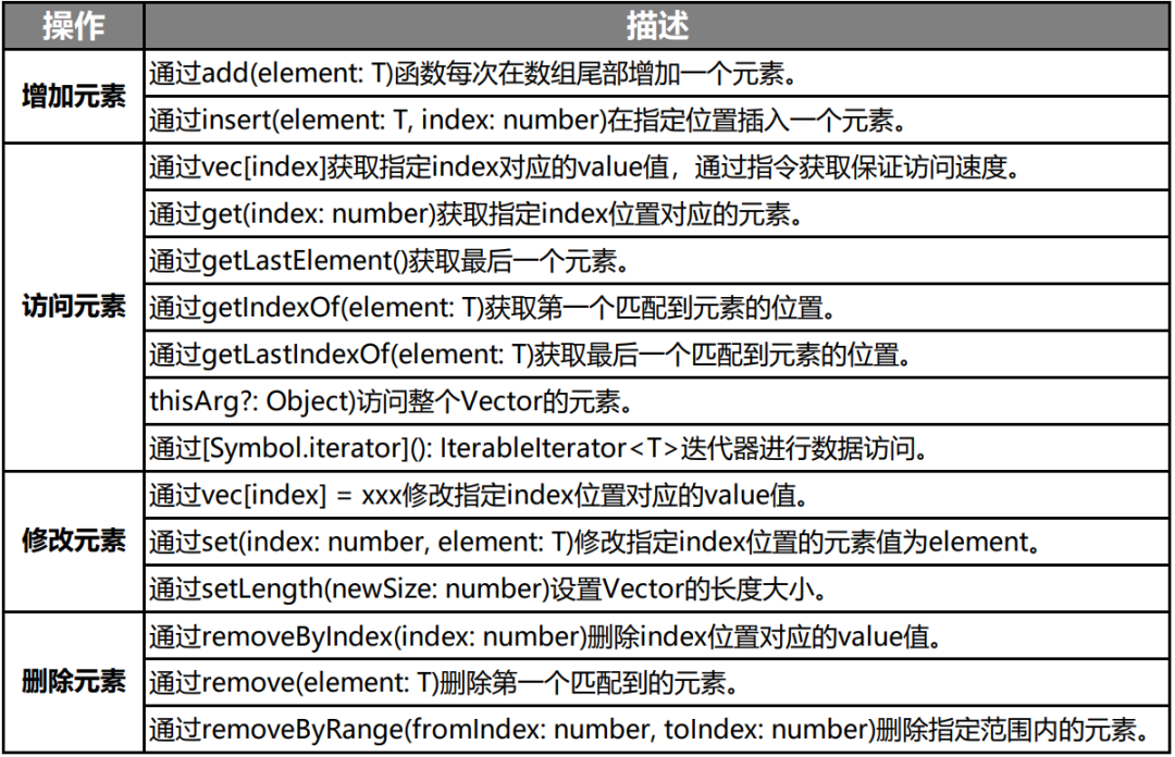 由于Vector扩容速度高于ArrayList,所以适用于数据添加比较频繁的场景。Vector在支持操作符访问的基础上,还增加了get/set接口,提供更为完善的校验及容错机制,满足用户不同场景下的需求。Vector进行增、删、改、查操作的相关API如下: