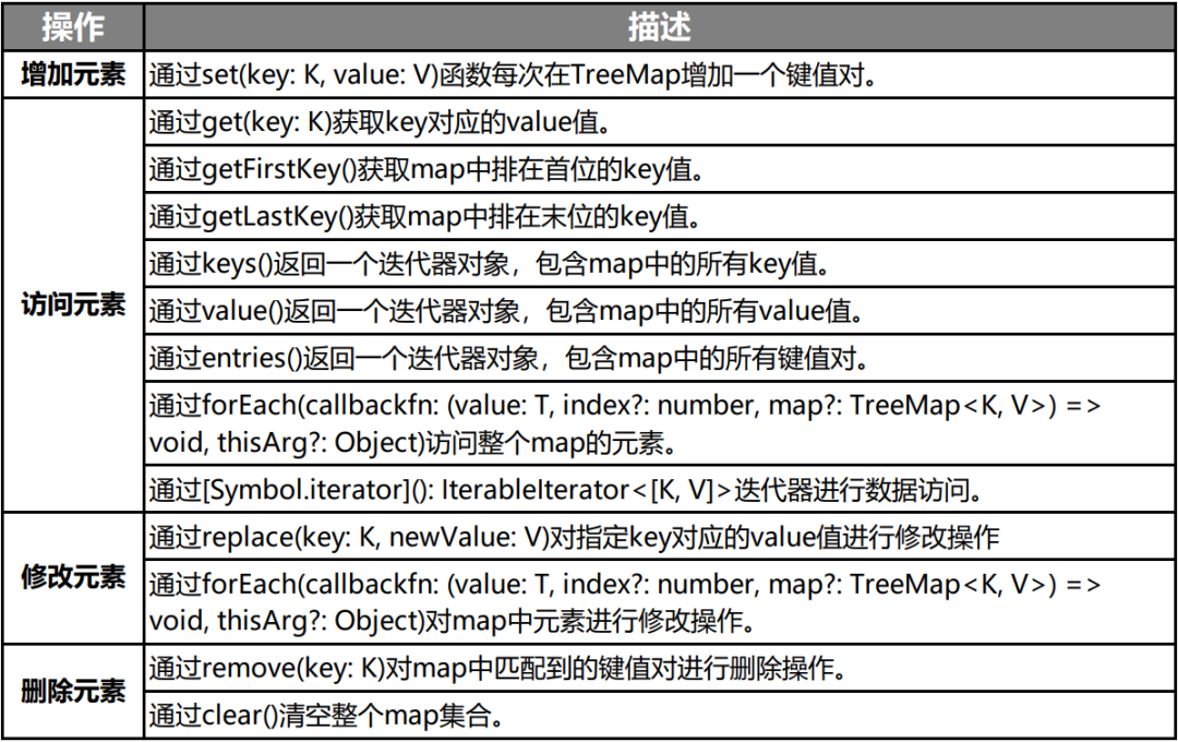 TreeMap可用来存储具有关联关系的key-value键值对集合,存储元素中key是唯一的,每个key会对应一个value值。TreeMap依据泛型定义,集合中的key值是有序的,TreeMap的底层是一棵二叉树,可以通过树的二叉查找快速的找到键值对。key的类型满足ECMA标准中要求的类型。TreeMap中的键值是有序存储的。TreeMap底层基于红黑树实现,可以进行快速的插入和删除。TreeMap进行增、删、改、查操作的相关API如下: