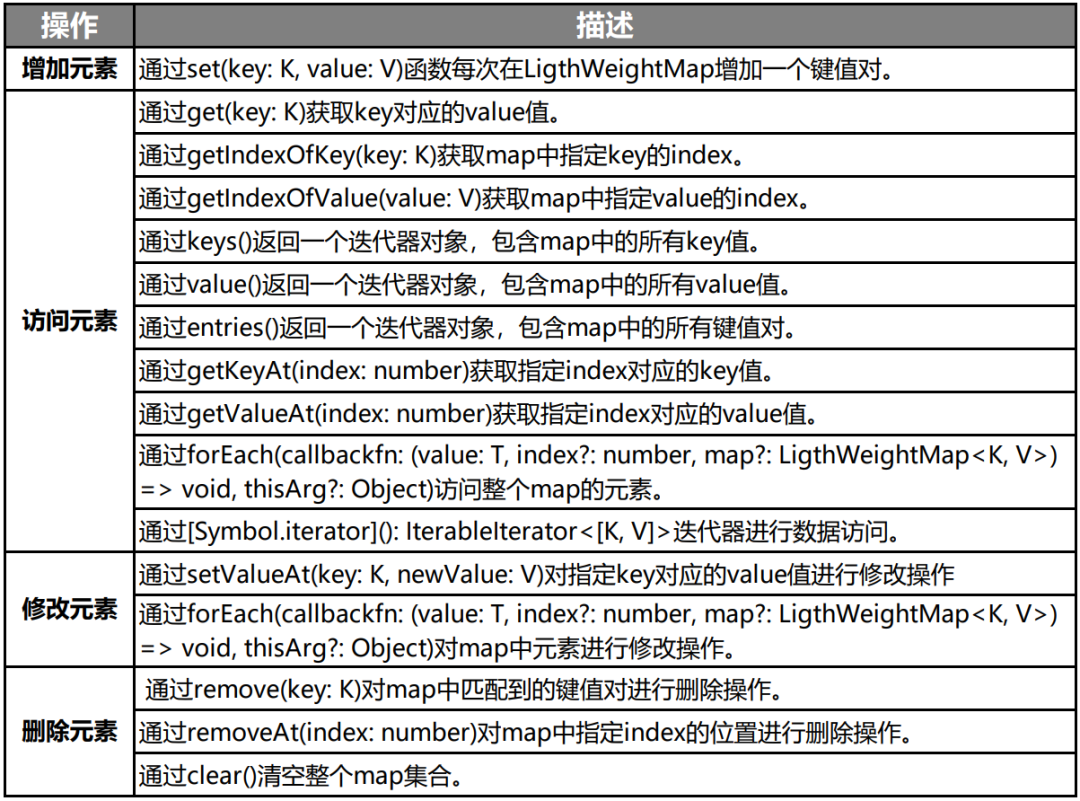 LigthWeightMap可用来存储具有关联关系的key-value键值对集合,存储元素中key是唯一的,每个key会对应一个value值。LigthWeightMap依据泛型定义,采用更加轻量级的结构,集合中的key值的查找依赖于hash值以及二分查找算法,通过一个数组存储hash值,然后映射到其他数组中的key值以及value值,key的类型满足ECMA标准中要求的类型。