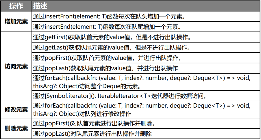 Deque可用来构造双端队列对象,存储元素遵循先进先出的规则,双端队列可以分别从对头或者队尾进行访问。Deque依据泛型定义,要求存储位置是一片连续的内存空间,其初始容量大小为8,并支持动态扩容,每次扩容大小为原始容量的2倍。Deque底层采用循环队列实现,入队及出队操作效率都比较高。Deque进行增、删、改、查操作的相关API如下: