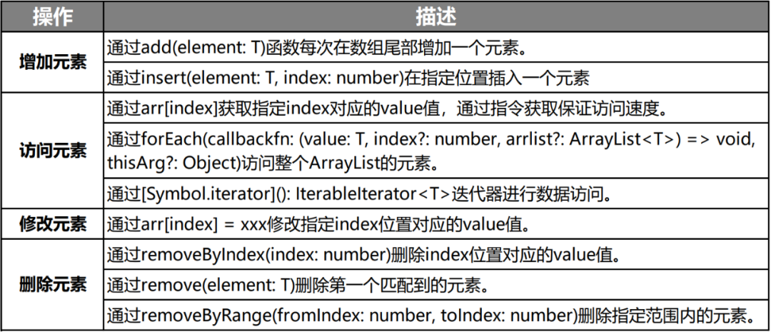 ArrayList即动态数组,可用来构造全局的数组对象。ArrayList依据泛型定义,要求存储位置是一片连续的内存空间,初始容量大小为10,并支持动态扩容,每次扩容大小为原始容量的1.5倍。ArrayList进行增、删、改、查操作的相关API如下:
